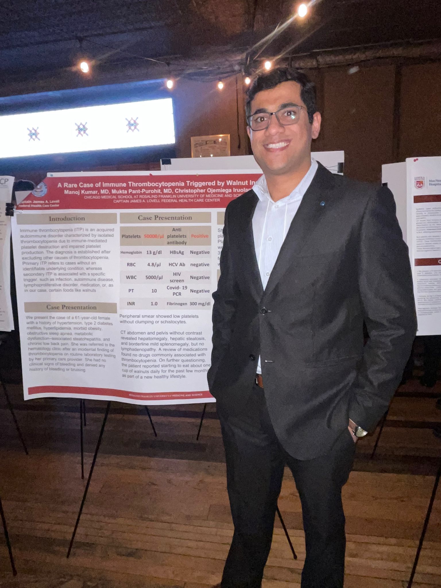 Manoj Kumar, MD, internal medicine resident, presented a poster titled “A Rare Case of Immune Thrombocytopenia Triggered by Walnut Ingestion” at the American College of Physicians Northern Illinois chapter poster competition, held November 12 in Berwyn, IL.